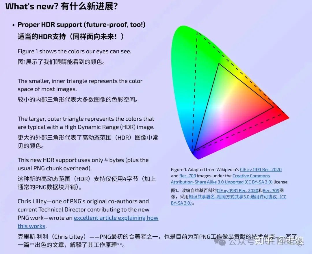 我更感兴趣的是它对动图的支持和Exif的提升。 动图APNG 动态PNG格式是Mozilla在很久以前提出的,但这一次才真正合入标准。APNG(Animated Portable Network Graphics)即动态便携式网络图形,是基于 PNG 格式扩展的动画格式,在图像质量、透明度、文件体积等方面具备优势。 APNG 以 PNG 规范为基础,存储为二进制文件,数据同样以 “块(chunks)” 的形式组织。在 PNG 原有结构上,APNG 引入了三个新的块类型:acTL(动画控制块)、fcTL(帧控制块)、fdAT(帧数据块)。acTL 块位于第一个 IDAT 块之前,用于标识该文件为 APNG 文件,同时包含动画的总帧数和循环次数信息。fcTL 块出现在每一帧之前,存储着帧的元数据 ,如帧的尺寸、位置、显示延迟、透明处理方式等。fdAT 块用于存储帧的内容,其结构与 IDAT 块类似,但开头多了一个序列号,该序列号与 fcTL 块中的序列号相关联,用于确保帧的正确顺序和时间控制。 APNG 的第一帧是普通的 PNG 流,这使得不支持 APNG 的软件或浏览器能够显示 APNG 文件的第一帧内容,忽略后续的动画块,从而实现了与 PNG 的向后兼容性。这点非常重要。 相比GIF仅支持 8 位颜色深度,最多显示 256 色,APNG 支持 24 位颜色深度,能够呈现超过 1600 万种颜色,且在色阶过渡上更平滑,图像质量更高,抗锯齿效果更好。APNG 支持 8 位 Alpha 透明通道,不仅可以实现完全透明,还能呈现透明度渐变效果 。而 GIF 只支持简单的全透明或不透明,在处理带有透明效果的图像时,边缘容易出现杂边,视觉效果不佳。APNG 采用 Deflate 压缩算法,在相同的图像内容和颜色深度下,APNG 文件体积往往比 GIF 更小。APNG 还会通过算法计算帧之间的差异,只存储帧之间的差异,而不是存储全帧,进一步减小了文件大小。 APNG最早2004 年由 Mozilla 公司的 Stuart Parmenter 和 Vladimir Vukićević设计提出,旨在替代老旧的 GIF 格式以及解决 MNG 格式程序库复杂、资源占用大的问题。但 APNG 在发展过程中面临诸多阻碍,2007 年 PNG 组织投票否决其成为官方标准,主要原因是 PNG 组织更倾向于推广 MNG,且 APNG 格式存在一些让软件难以区分动画和非动画图像的问题。不过,Mozilla Firefox 从 2007 年 3 月的 3.0 版本开始支持 APNG,随后,Safari、Chrome 等浏览器也陆续加入支持行列。不过直到目前为止,Google都拒绝支持这种格式,但不出意外,Apple却十分欢迎它。 Exif的提升 PNG 第三版规范对 Exif(Exchangeable Image File,可交换图像文件)的支持有了显著提升,主要体现在将其纳入主规范,优化存储格式,并提高兼容性和适用性。在旧规范中,Exif并非 PNG 的标准组成部分 ,而在第三版规范里,它成为主规范的一部分。这意味着 Exif在 PNG 文件中的使用有了官方规范依据,软件开发者能依据规范更好地实现对 Exif数据的处理,提升了 Exif数据在 PNG 图像中的地位和规范性。 eXIF 数据在 PNG 中的存储格式得到明确规范。数据段按 “4.7.2 Interoperability Structure of APP1 in Compressed Data” of [CIPA - DC - 008] 规定的格式存储,但去掉了 JPEG APP1 标记、长度以及 “Exif ID code”(即 “Exif”、NULL 和填充字节) 。这种优化后的格式更贴合 PNG 文件结构,减少了冗余信息,提高了存储效率,也便于软件解析和处理 Exif数据。 新规范下,虽然对 Exif数据在 PNG 中的存储有了明确规定,但也指出若图像编辑后,Exif数据可能不再适用,建议解码器谨慎对待。这说明规范在考虑到实际应用中图像编辑情况的同时,也为软件开发者处理 Exif数据提供了指导,提高了 PNG 文件在不同场景下对 Exif数据的兼容性和适用性。 结语 展望未来,PNG 3.0 规范蕴含着无限潜力。随着 APNG 被纳入核心规范,将激励更多开发者利用其特性,创作出更丰富、生动且高质量的动画内容,无论是在网页、应用程序还是游戏领域,APNG 有望逐步取代 GIF 在动画领域的地位。HDR 支持的加入,使得 PNG 在处理专业图像、摄影作品等方面更具优势,随着 HDR 显示设备的进一步普及,基于 PNG 3.0 的 HDR 图像将为用户带来更为逼真、震撼的视觉体验。而对 Exif 元数据的支持,能极大地便利图像的管理、检索与后期处理,特别是对于摄影师、设计师等专业人士而言,这一功能将成为工作流程中的得力助手。 期待PNG 3.0尽快来到,让我们摆脱GIF粗糙庞大的动图! 参考资料 【1】PNG is BACK: https://www.programmax.net/articles/png-is-back/ 【2】png 3: https://www.w3.org/TR/png-3/ 【3】PNG 2.0: https://www.w3.org/TR/2003/REC-PNG-20031110/